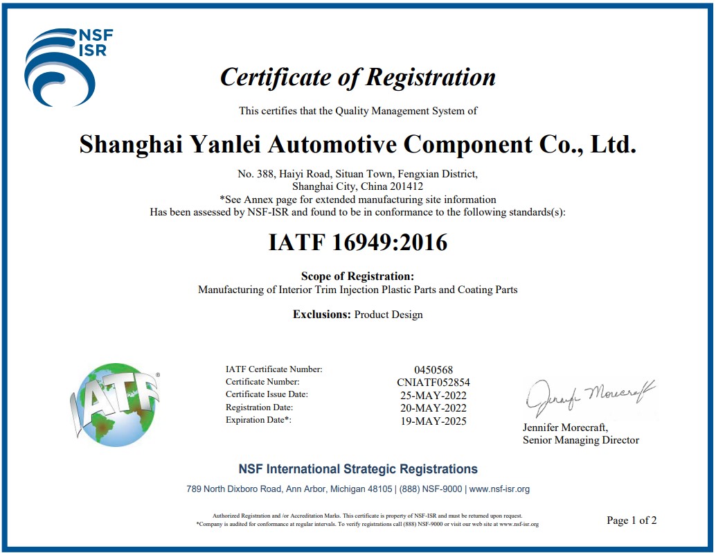 2019年5月份獲得了ITAF/TS 16949質(zhì)量管理體系認證證書。